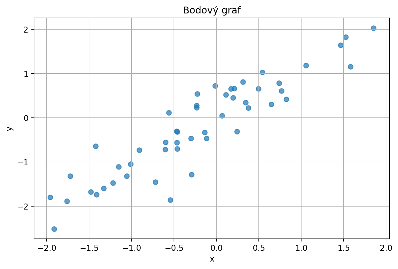 y = x + np.random.randn(50) * 0.5 # y závisí na x + šum