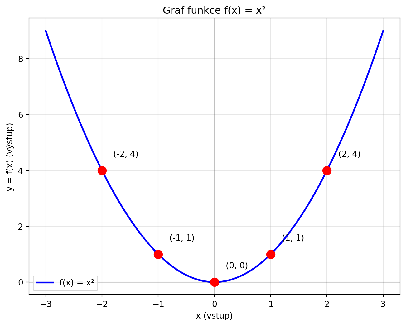 - **Graf funkce** zobrazuje všechny dvojice (vstup, výstup)
