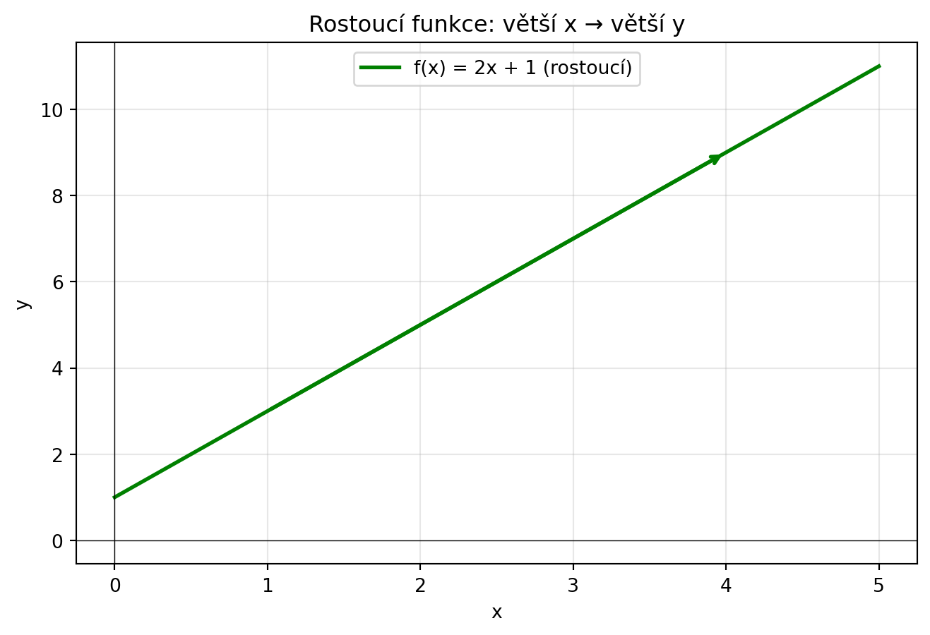 - Funkce je **rostoucí**, když větší x dává větší y