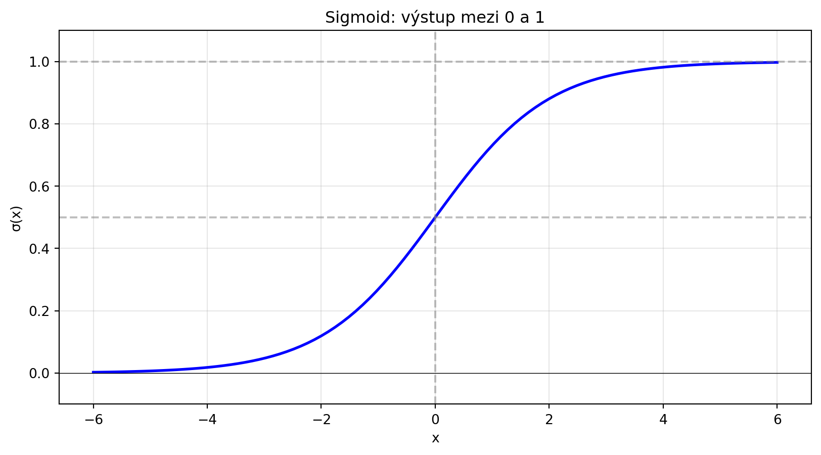 - **Sigmoid**: $\sigma(x) = \frac{1}{1+e^{-x}}$, výstup mezi 0 a 1