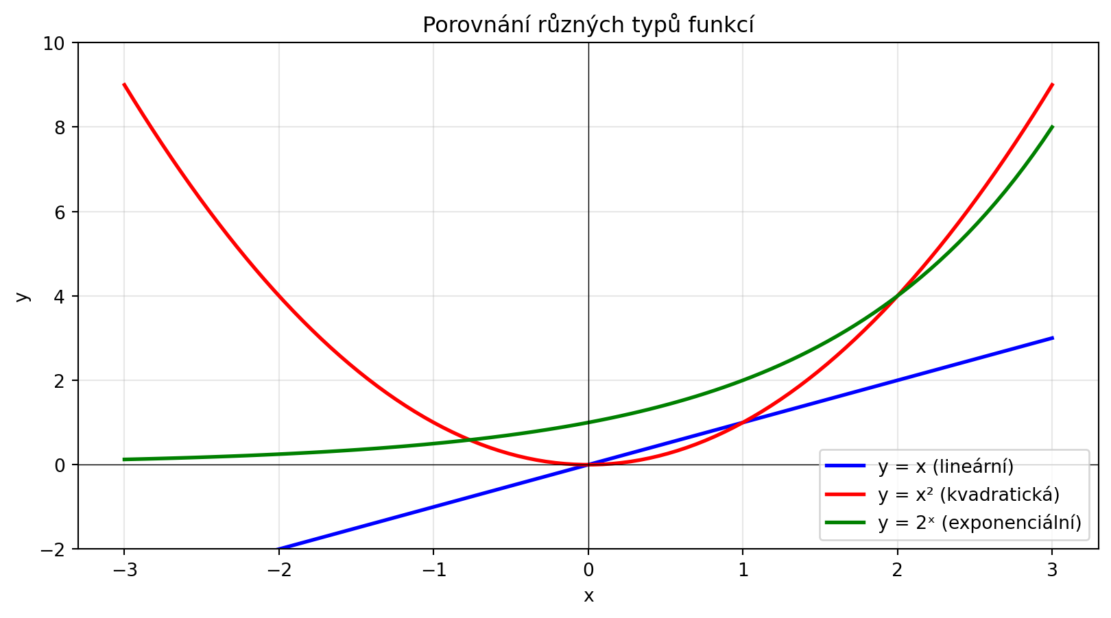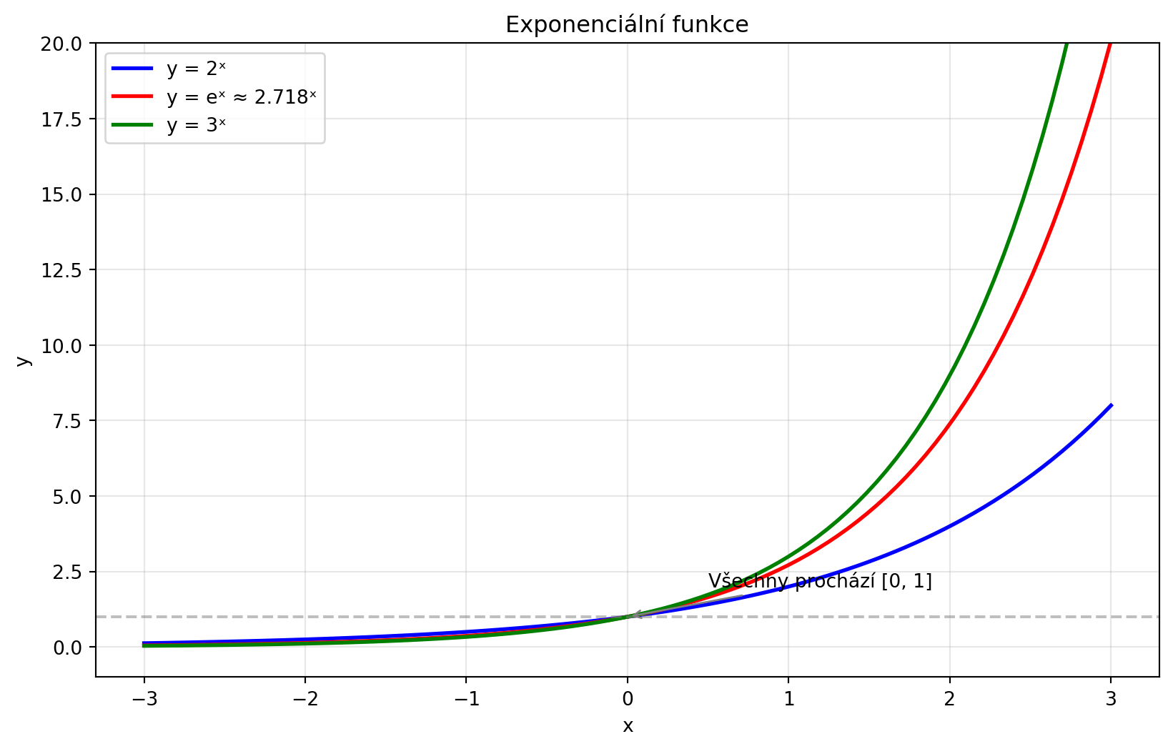 - **Exponenciální funkce**: $f(x) = a^x$, rychlý růst/pokles