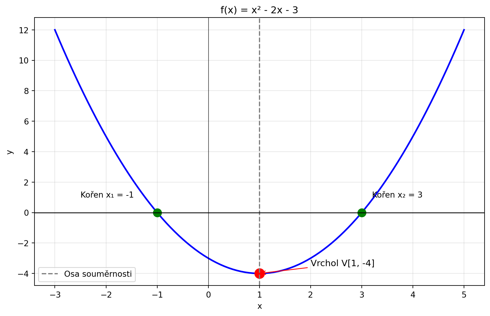 ax.annotate('Kořen x₁ = -1', xy=(-1, 0), xytext=(-2.5, 1), fontsize=10)
