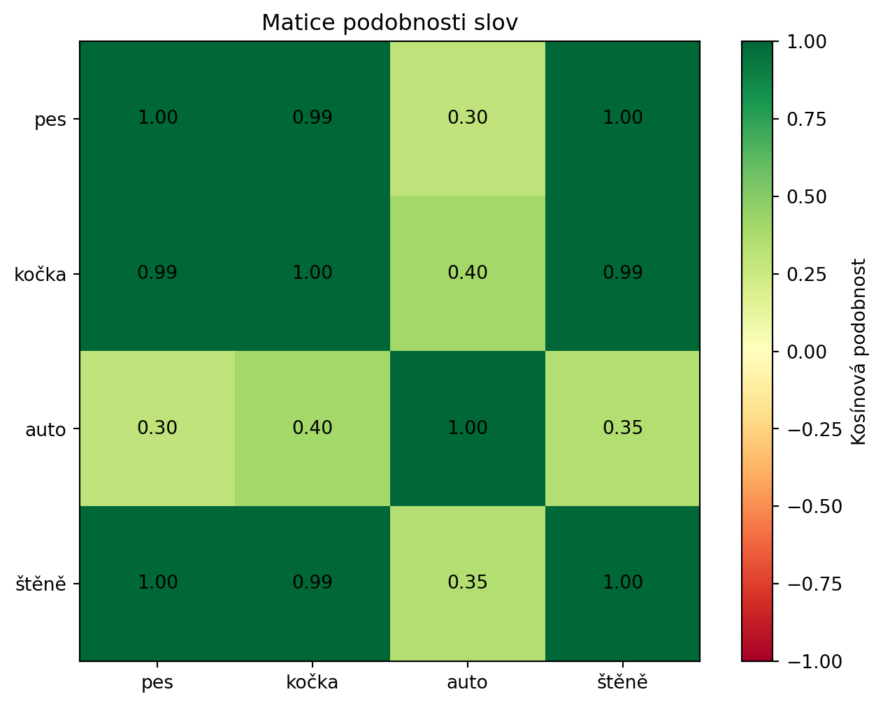 Vypočítejte kosínovou podobnost vektorů \([3, 4]\) a \([6, 8]\).