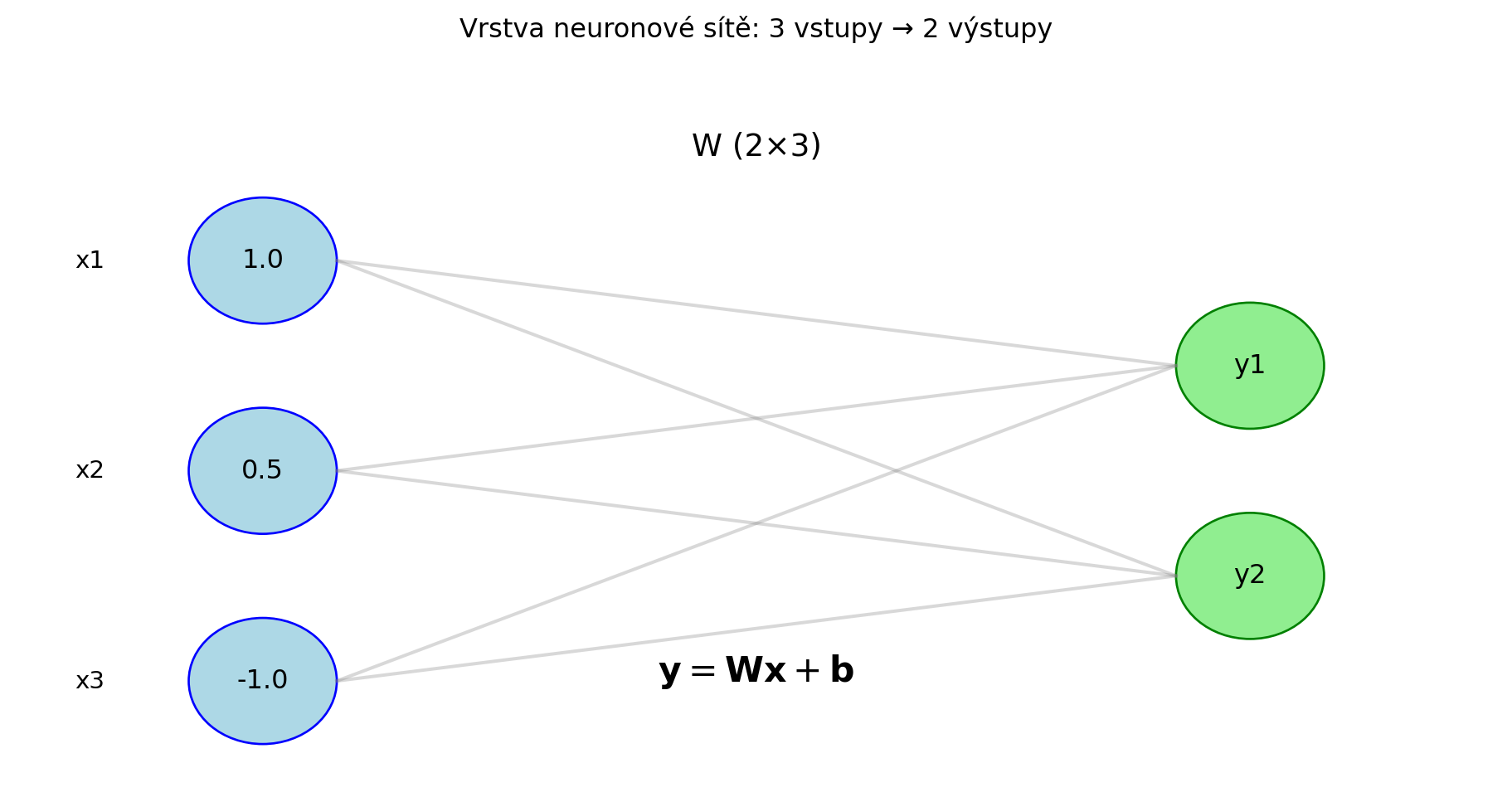 Maticové násobení je **srdce** neuronových sítí. Každá vrstva neuronové sítě provádí: