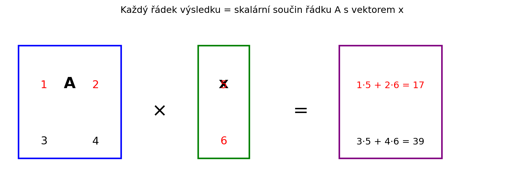 ax.set_title('Každý řádek výsledku = skalární součin řádku A s vektorem x', fontsize=12)