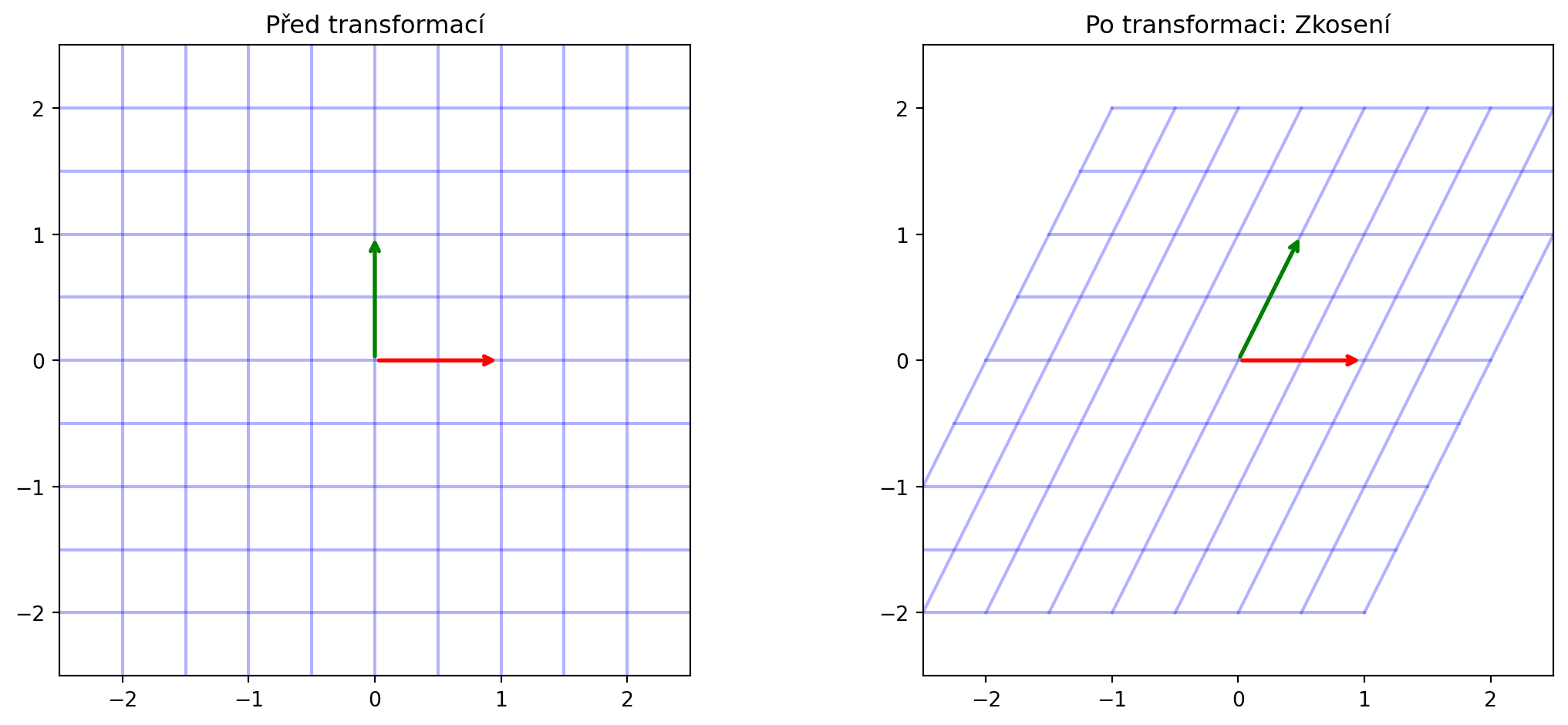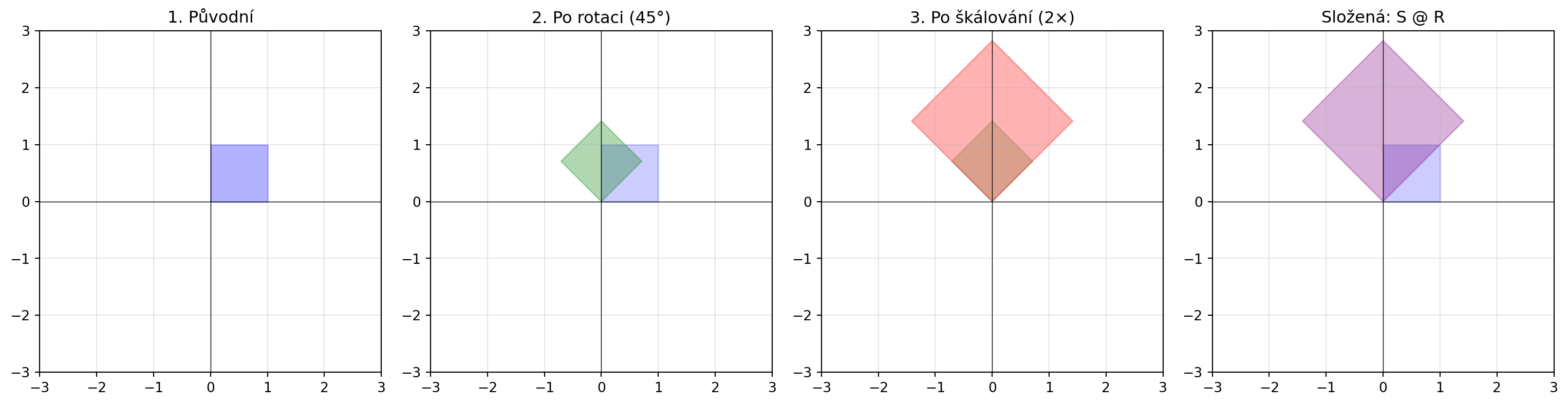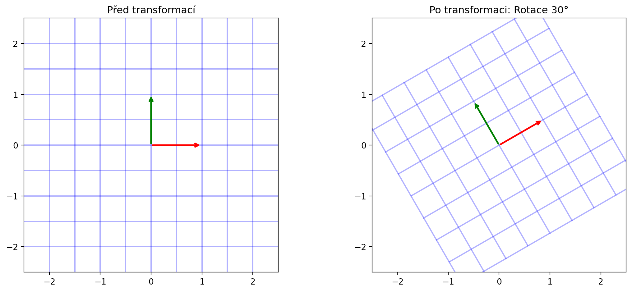 - **Rotace o θ**: $\begin{bmatrix} \cos\theta & -\sin\theta \\ \sin\theta & \cos\theta \end{bmatrix}$