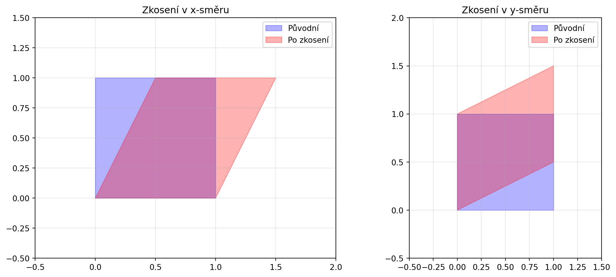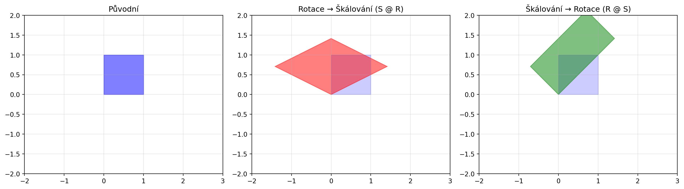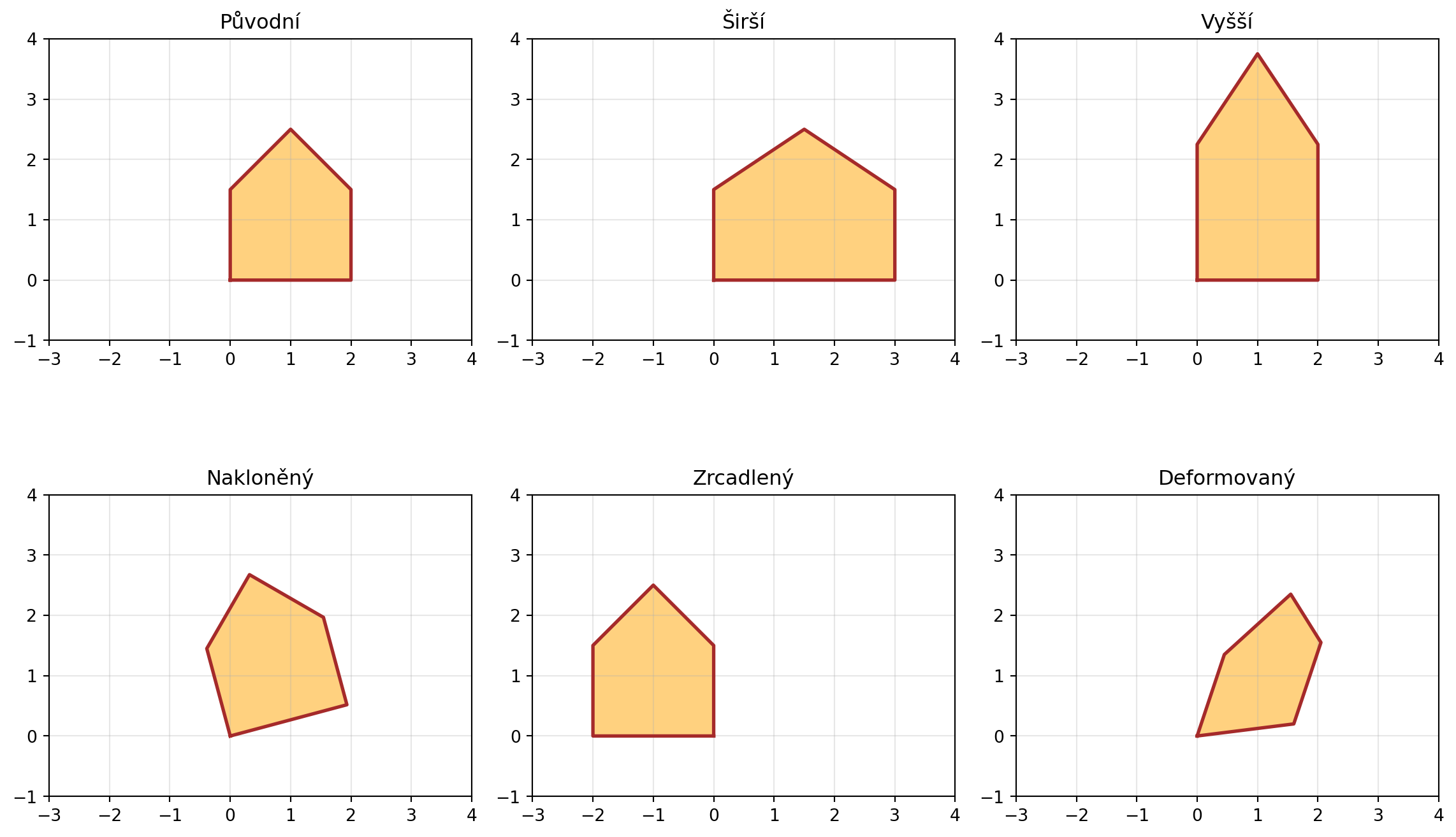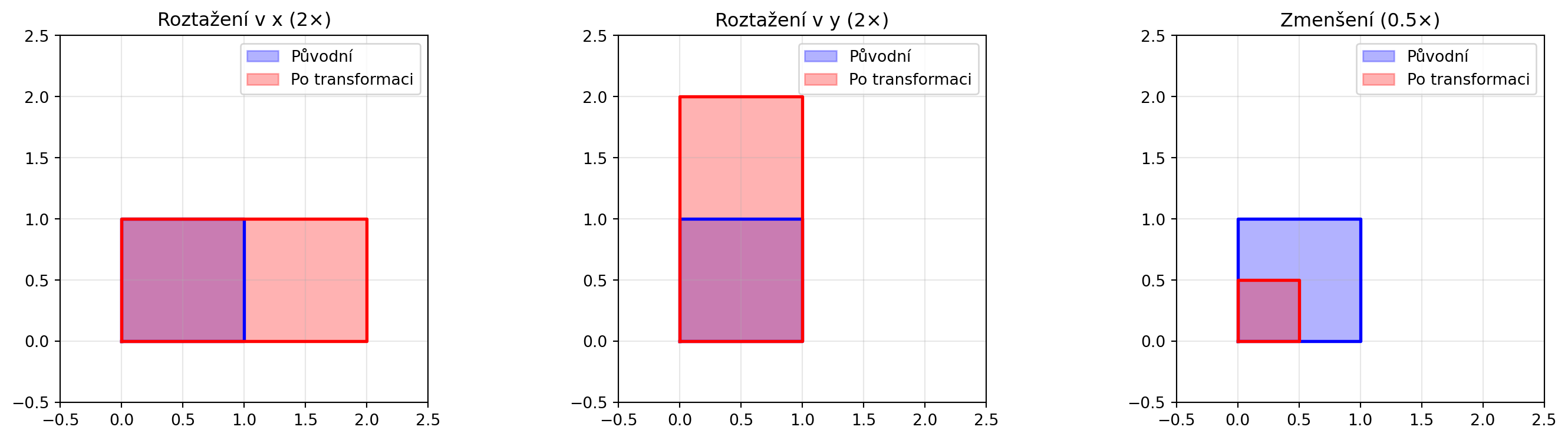 - **Škálování**: $\begin{bmatrix} s_x & 0 \\ 0 & s_y \end{bmatrix}$