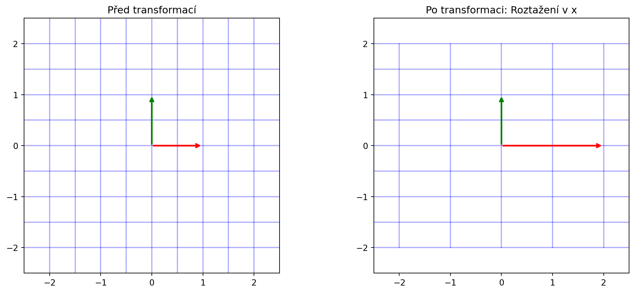 (np.array([[2, 0], [0, 1]]), "Roztažení v x (2×)"),
