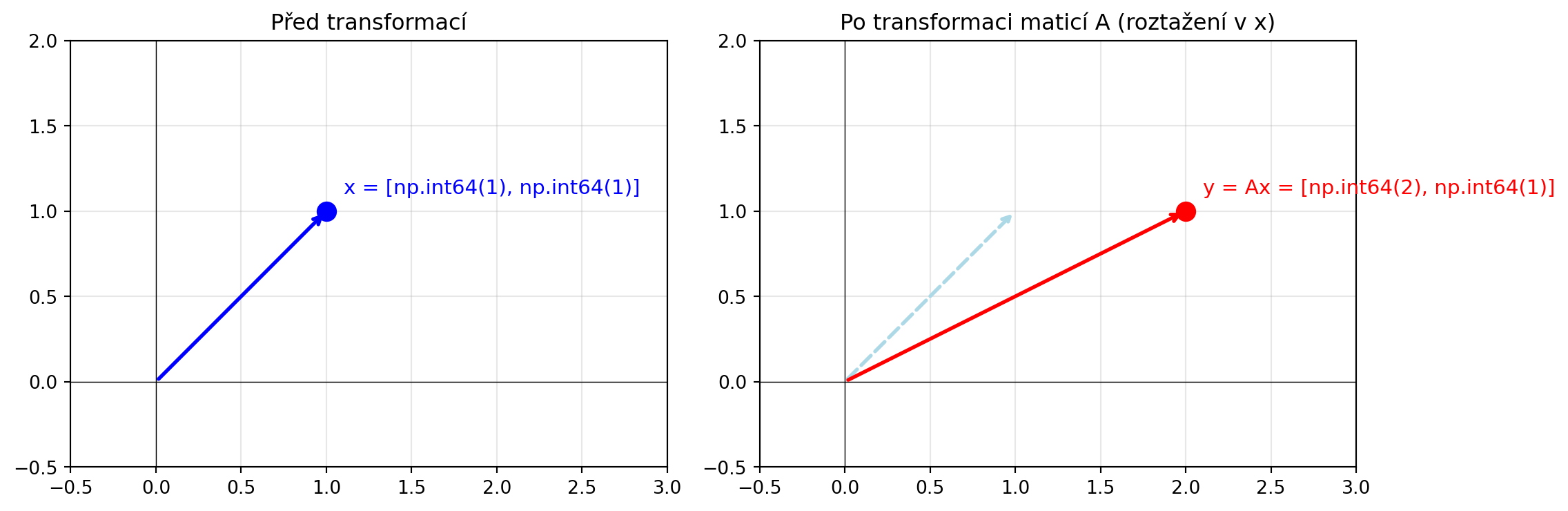 Každá matice reprezentuje **transformaci** -- přeměnu jednoho vektoru na jiný. Když vynásobíme vektor maticí, "transformujeme" ho.