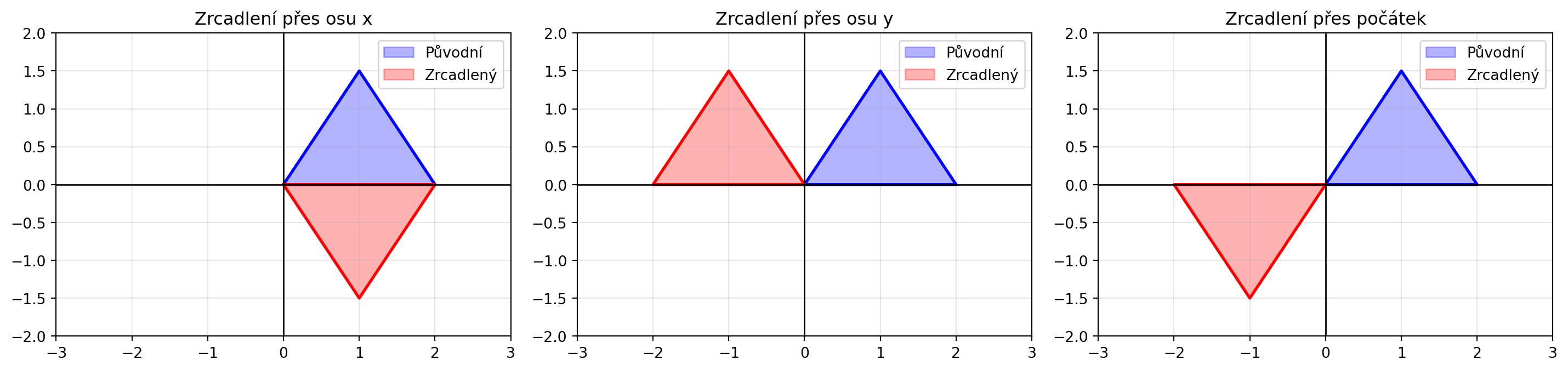 - **Zrcadlení přes x**: $\begin{bmatrix} 1 & 0 \\ 0 & -1 \end{bmatrix}$