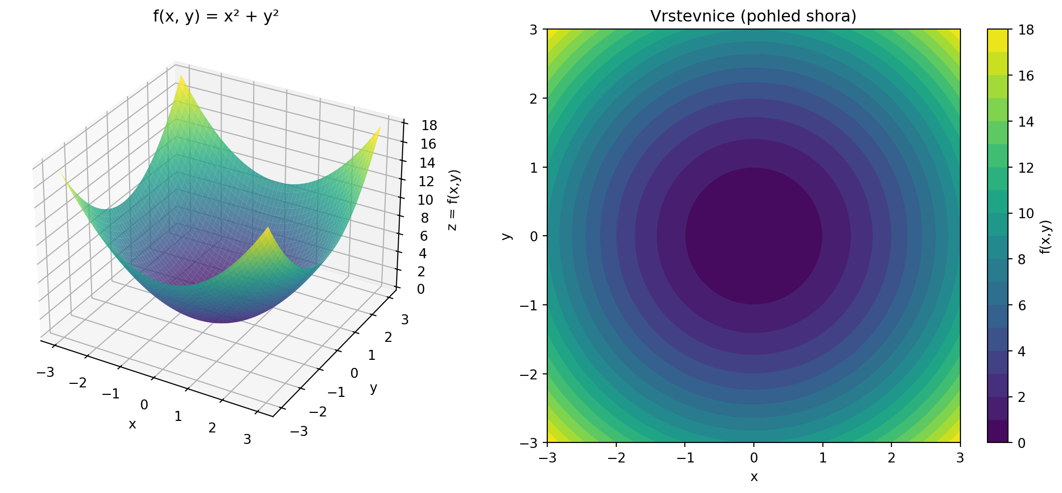 print(f"\nGradient v bodě (1, 2): [{grad_x}, {grad_y}]")