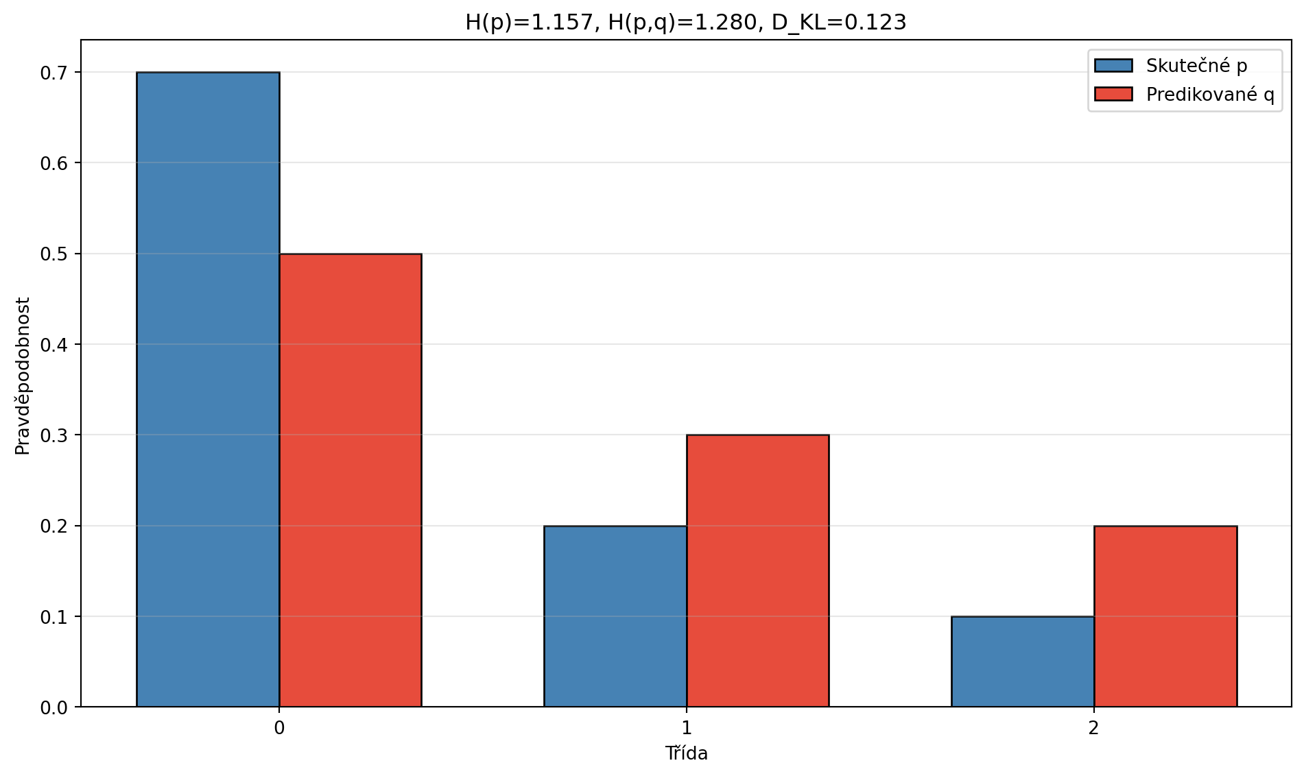 3. **Cross-entropy** $H(p,q) = -\sum p_i \log_2(q_i)$ měří kvalitu predikce
