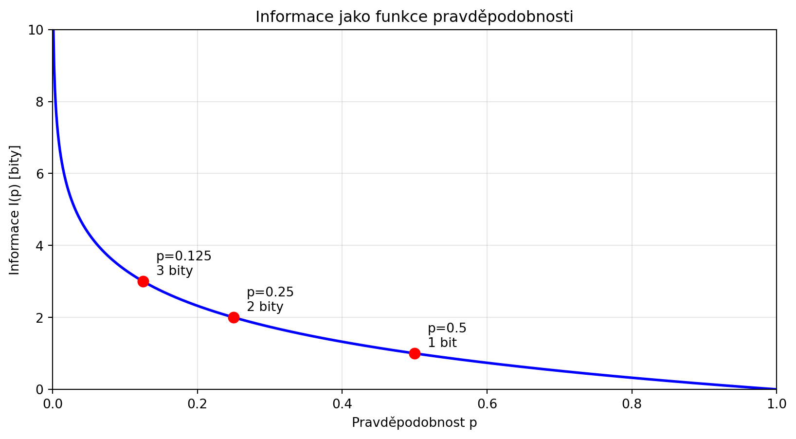 1. **Informace** $I(p) = -\log_2(p)$ měří překvapení z události