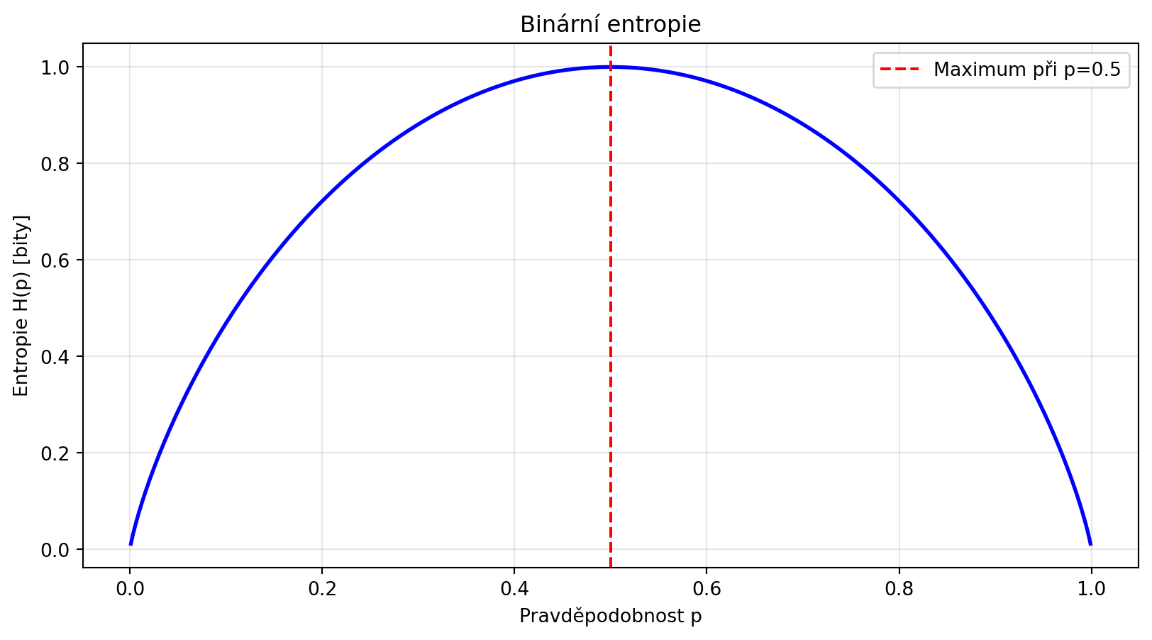 print("Binární entropie je maximální při p=0.5 (největší nejistota)")