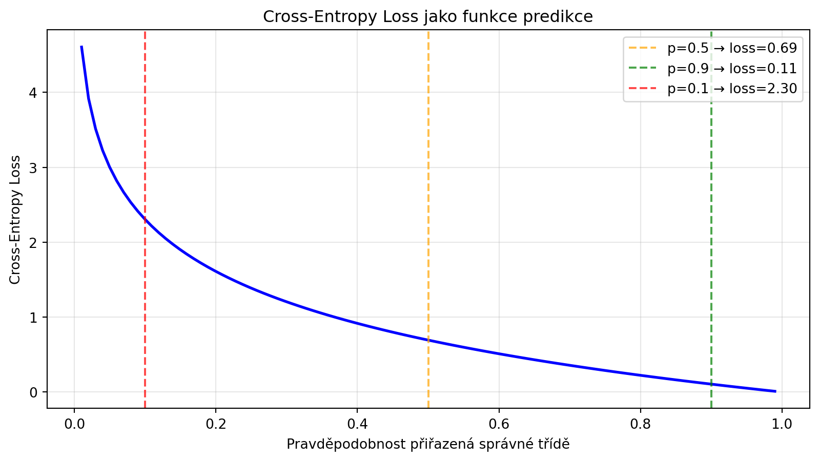 - **Cross-entropy loss** - nejpoužívanější loss funkce pro klasifikaci