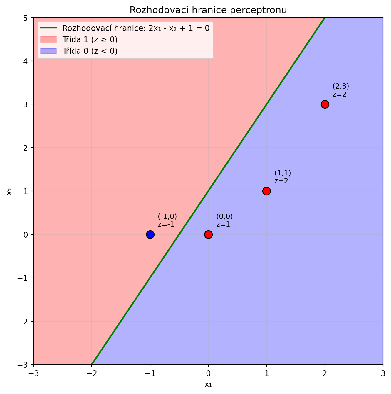 plt.plot(x1, x2, 'g-', lw=2, label='Rozhodovací hranice: 2x₁ - x₂ + 1 = 0')