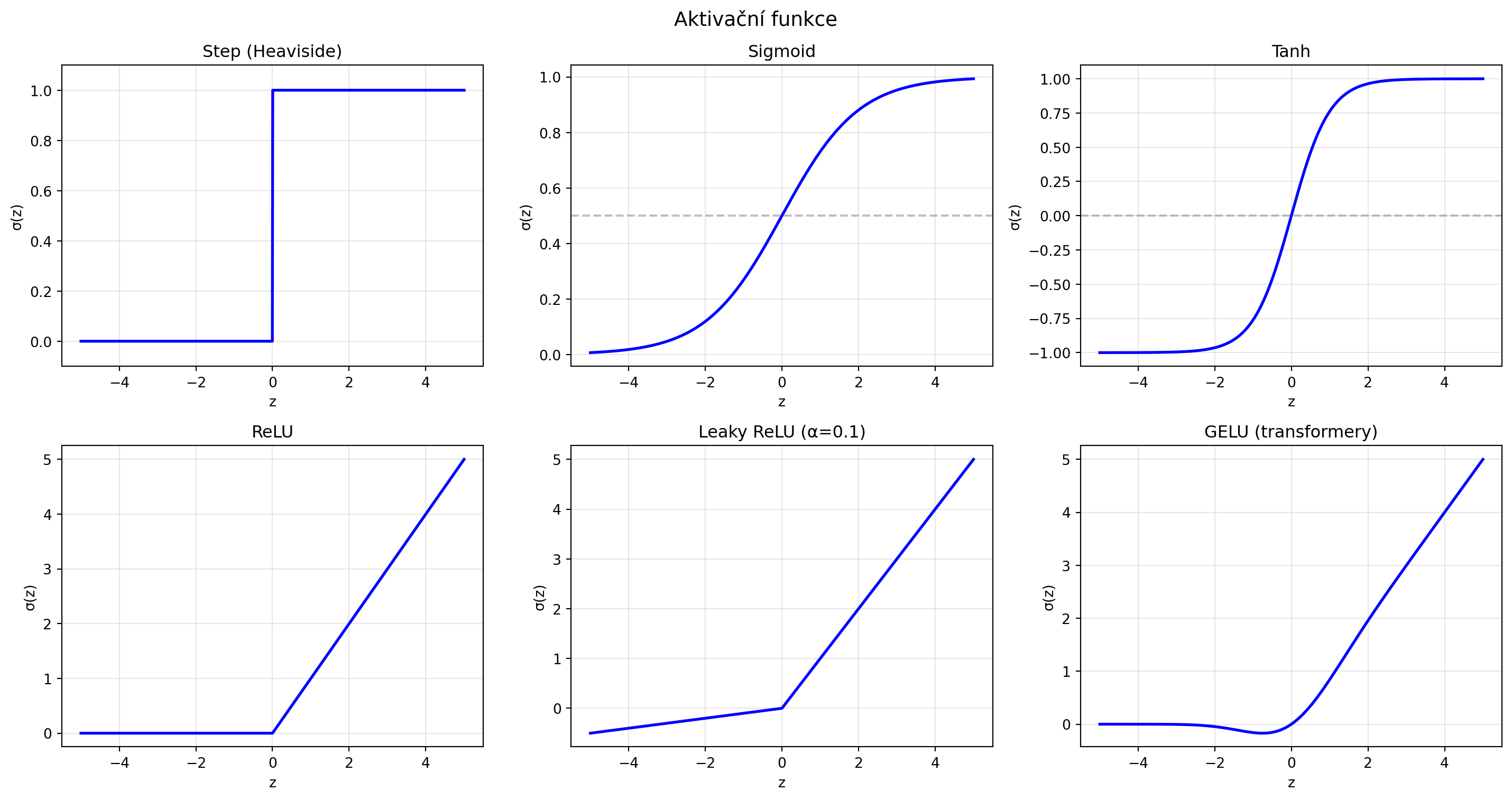 3. **Aktivační funkce** vnáší nelinearitu (sigmoid, ReLU, ...)