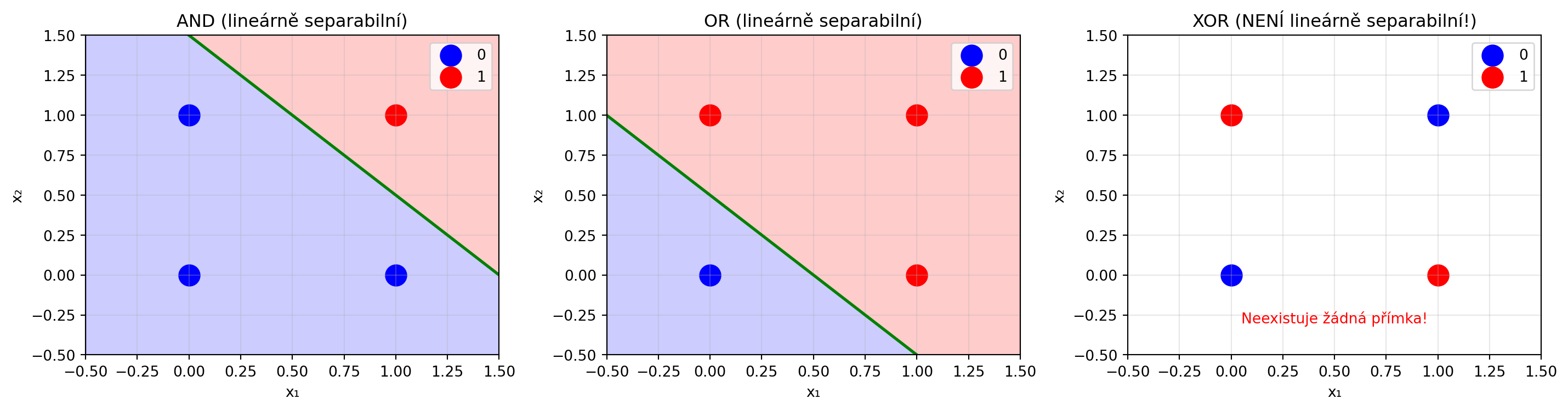 6. **Limit**: Perceptron nezvládne XOR a jiné nelineární problémy