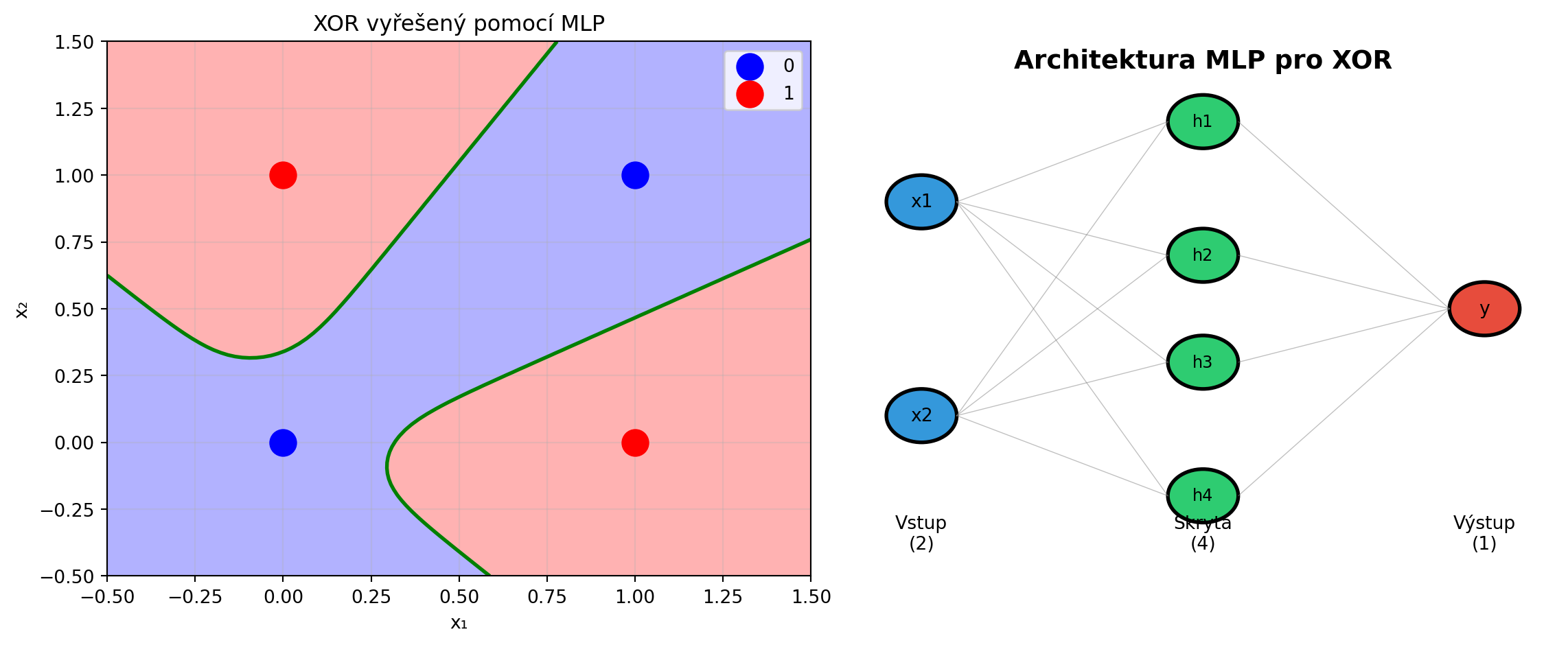 ax2.text(0.5, 0.95, 'Architektura MLP pro XOR', ha='center', fontsize=14, fontweight='bold', transform=ax2.transAxes)