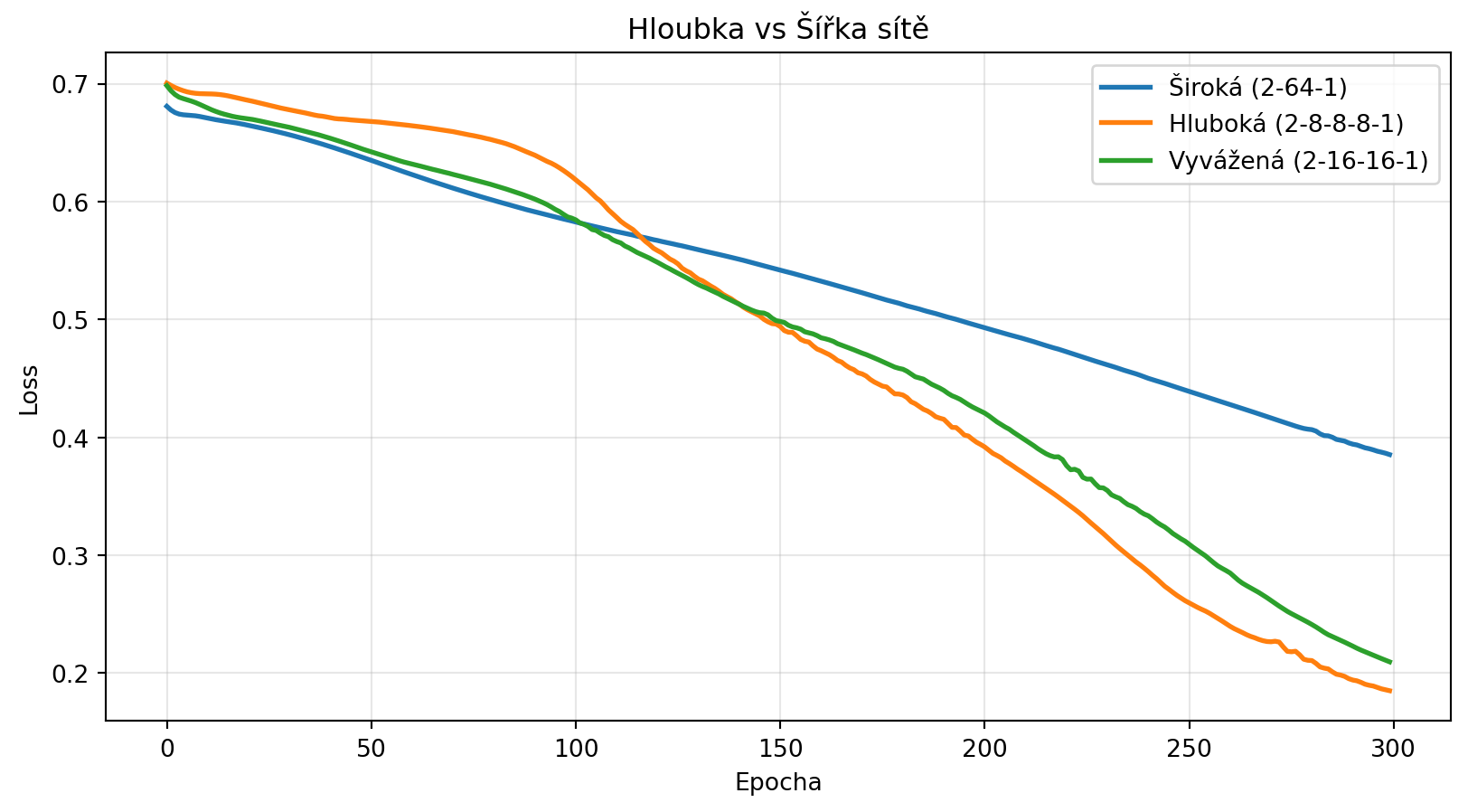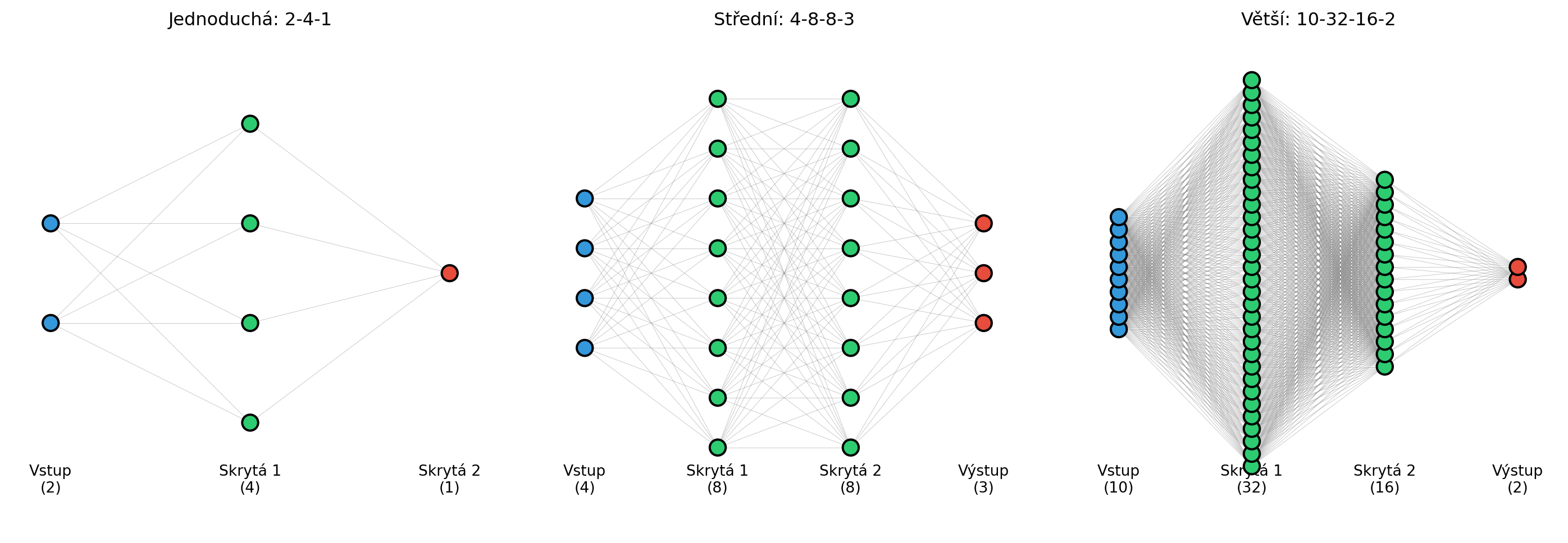 3. **Hloubka vs šířka**: hlubší sítě mohou být efektivnější, ale jsou těžší na trénování