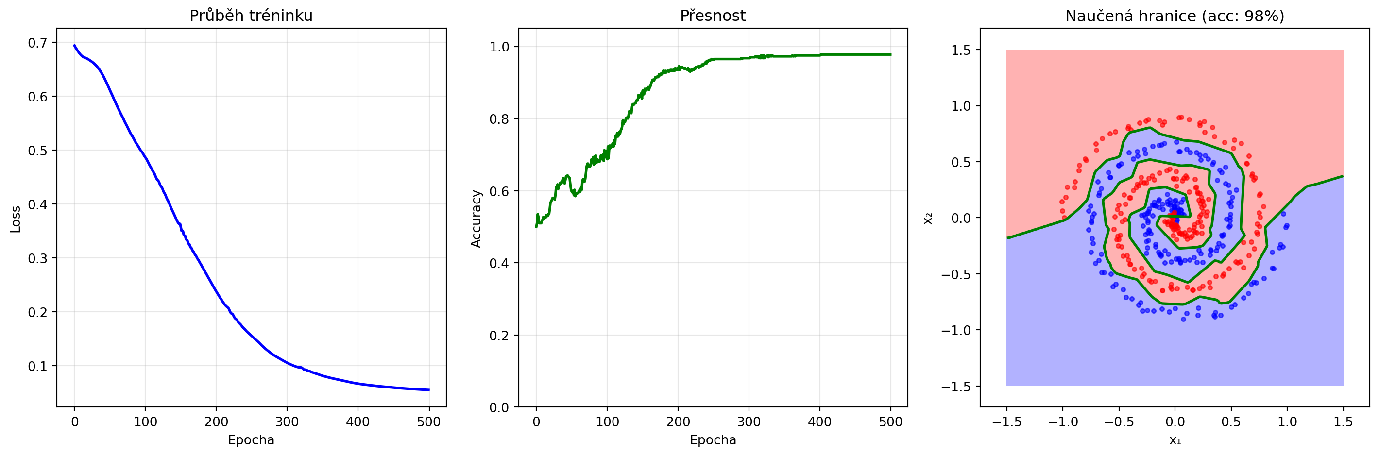 print("MLP dokáže vytvořit nelineární rozhodovací hranici!")