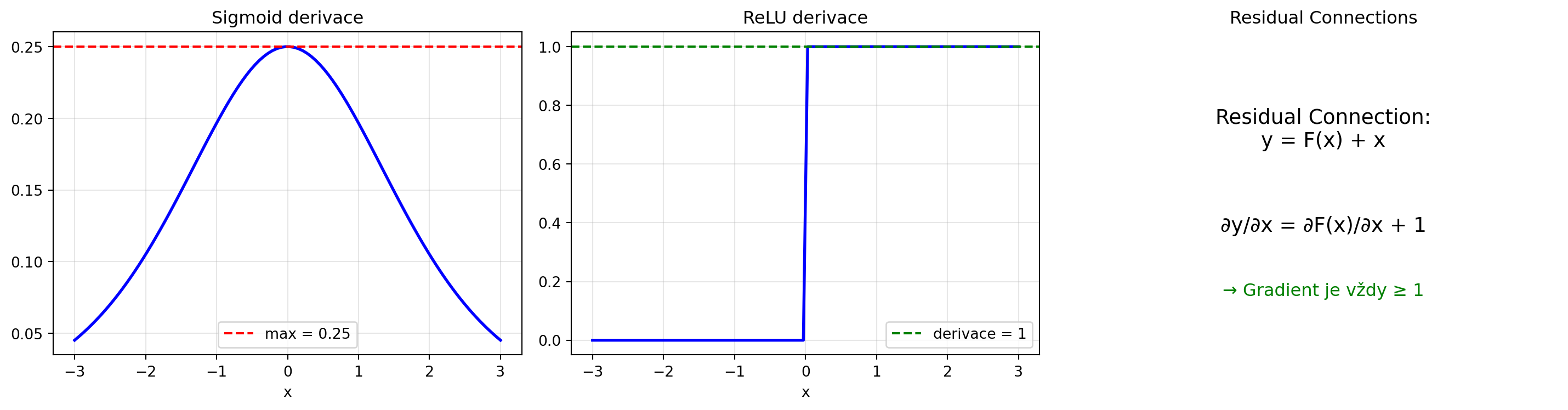 - **ReLU derivace**: $\text{ReLU}'(z) = \mathbb{1}_{z > 0}$