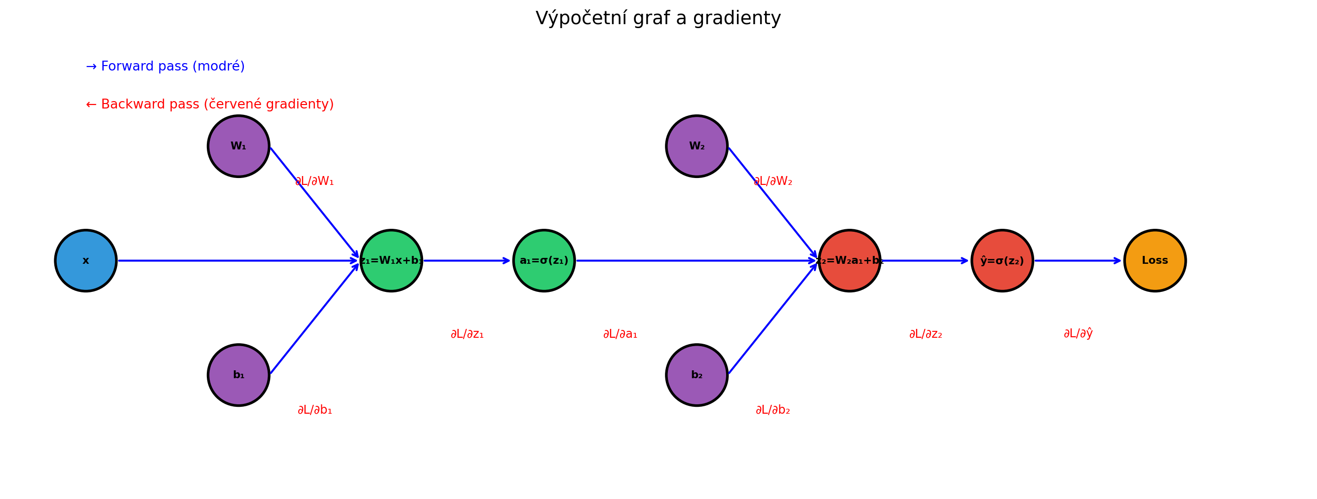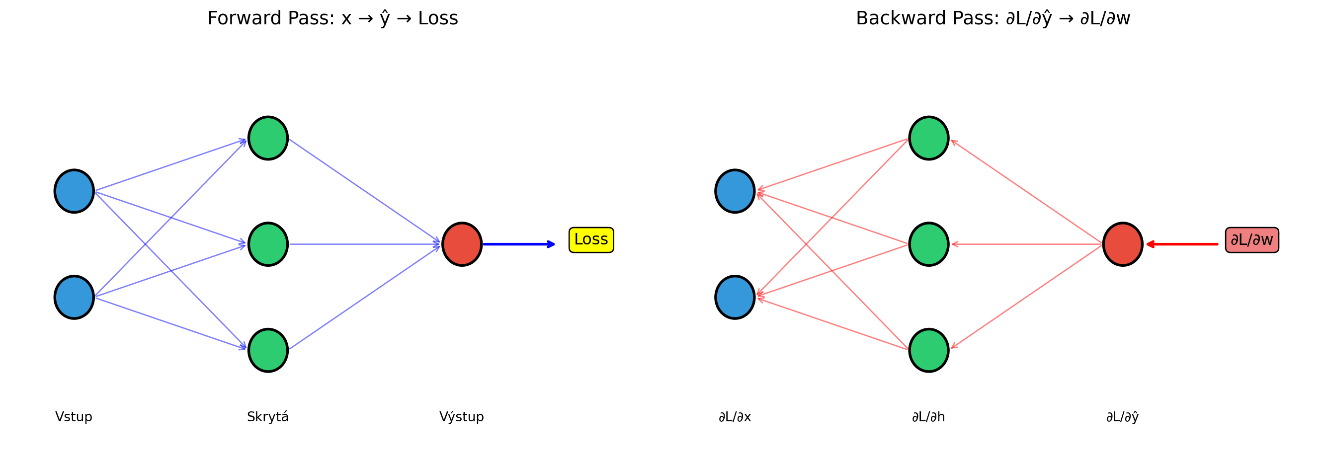 3. **Backward pass** propaguje gradienty od výstupu ke vstupu