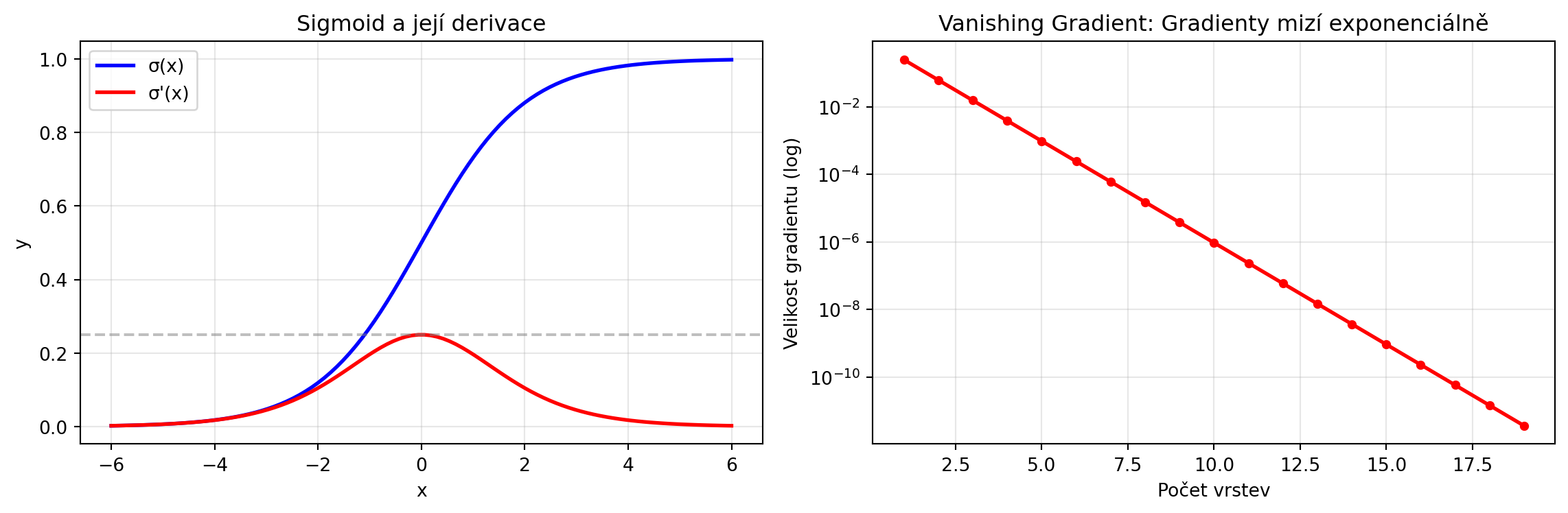 - **Sigmoid derivace**: $\sigma'(z) = \sigma(z)(1 - \sigma(z))$